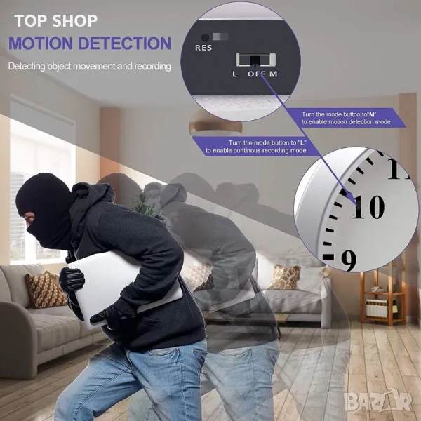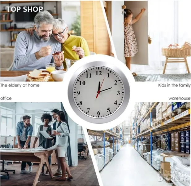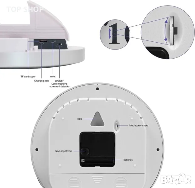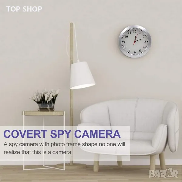 Шпионска камера със специален дизайн: Външният вид на шпионската камера е класически стенен часовник(8,7 инча и има функцията за време на часовник. Шпионската камера е умело монтирана в стенния часовник и никога няма да предизвика проблеми или съмнения. Той отговаря на нуждите на клиента от синхронизиране на часовника и отговаря на тайните нужди на клиента за наблюдение. Красив дизайн, може да се постави навсякъде в къщата или офиса, спалня, кухня, всекидневна, нощно шкафче, масичка за кафе или конзола, сбогувайте се с проблемите
