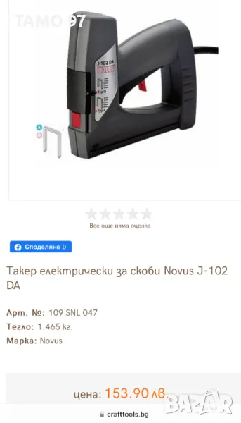 Продавам електрически такер на NOVUS в отлично визуално състояние и работи перфектно, немско производство внос от Франция.Пращаме с опция преглед и тест с куриерска фирма еконт може и лично предаване за гр. Шумен. Магазинската цена е: 153лв.