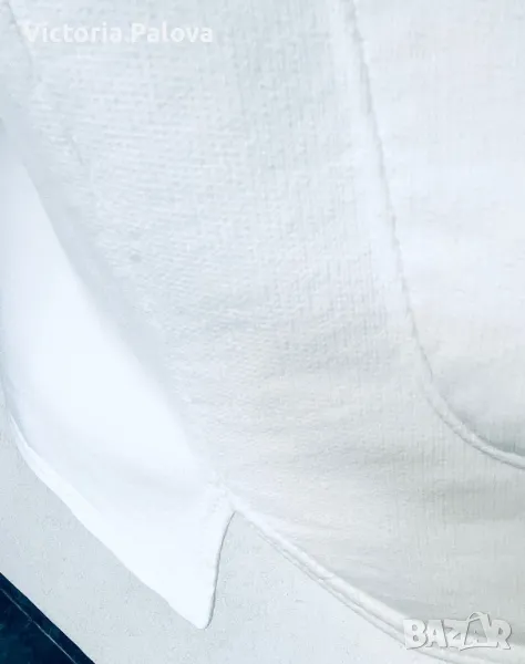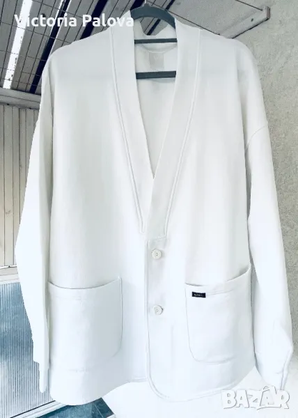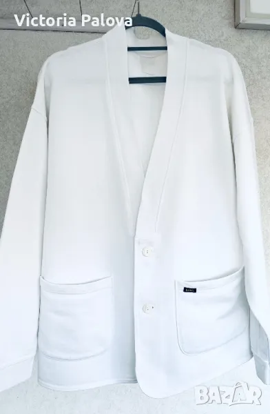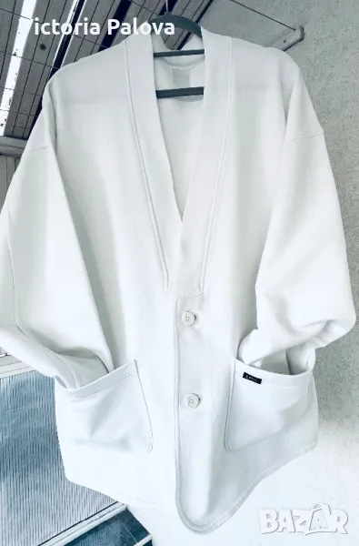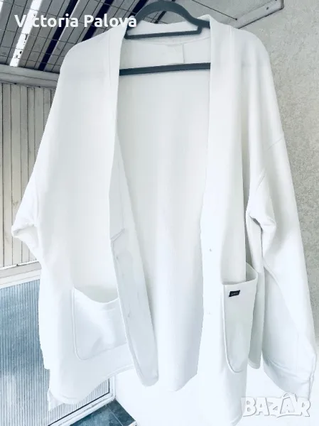 Много хубава жилетка от плътен качествен белоснежен памук. Много красива, две копчета, джобове. Рамо ( паднало) - 67см, ГО - 63см, дължина - 75см, ръкав - 56см. Жилетката може да се носи разкопчана като връхна риза.