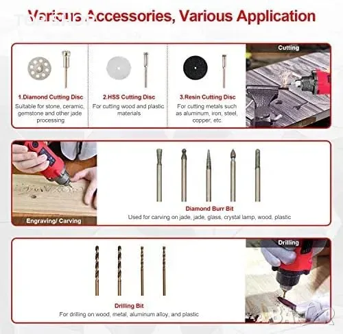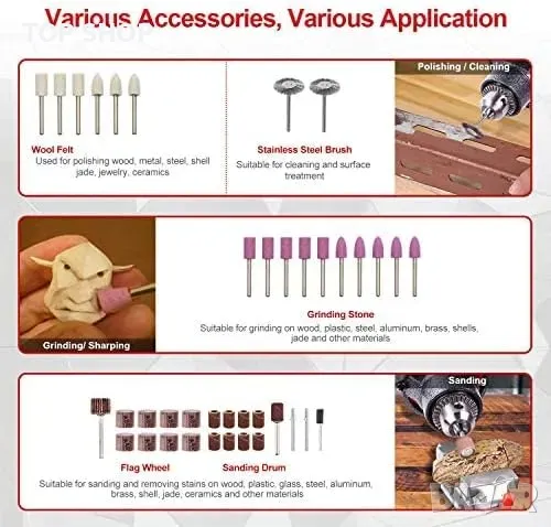 Богати аксесоари: Комплектът за въртящи се инструменти включва 170 аксесоара: гъвкав вал, въртящ се накрайник, телена четка, абразивен камък, филцово колело, шкурка, мини режещи дискове и др. Различен инструмент за различни DIY нужди