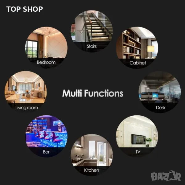 【Музикални LED лентови светлини за декорация】Осветлението се синхронизира с всеки ритъм на музиката, цветовете и скоростта се регулират автоматично въз основа на ритъма и мелодията, или ритми на музика или пляскания с ръце. Тази променяща цвета си лентова светлина може да украси вашата спалня, таван, стълби , кухненски шкаф, веранда, бюро и всекидневна, особено чудесно за празници като Коледа, Хелоуин, партита и т.н. Дава ви цветен живот.