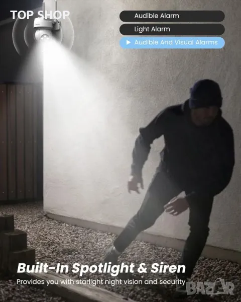 【Супер цветно нощно виждане】 Camara de seguridad para casa има две цветни конфигурации за нощно виждане. Когато включите функцията "цветна нощ" на режима за нощно виждане, можете да получавате цветни изображения и видеоклипове през целия ден. Когато включите само „звукова и визуална аларма“ в настройката на алармата, охранителната камера на открито ще заснема само цветни изображения за нощно виждане, когато алармата е подадена. Следователно wifi камерата може да заснеме повече детайли през нощта.