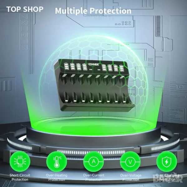 【Индивидуални отделения за зареждане】Универсалното зарядно устройство OOHHEE разполага с 8 отделни отделения за зареждане и поддържа смесен режим на зареждане. Подходящ за Ni-CD Ni-Mh AA/AAA батерии.