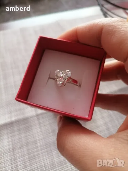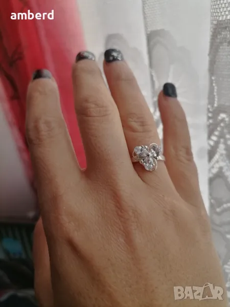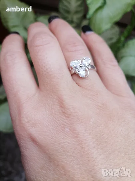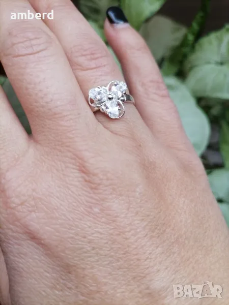 Елегантен и стилен пръстен, изработен от сребро проба 925 и 3 бели циркони. Вътрешен диаметър 17мм. Тегло 2.50гр.