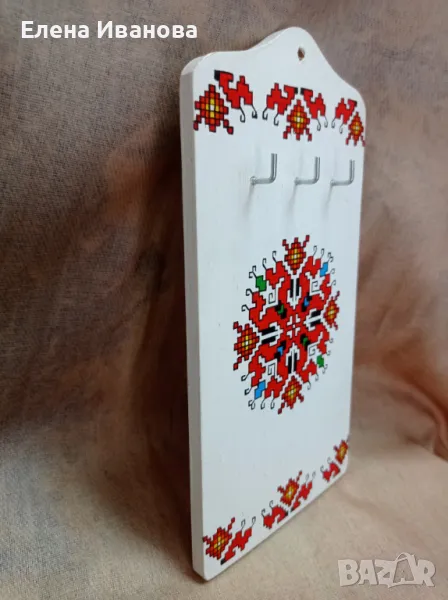 Декоративна дъска за ключове.Удобна за поставяне на ключове.Ръчно рисувана шевица с акрилни бои.Лакирана сакрилен лак.Размери 21/11/0,7 см.Цена 35 лв.