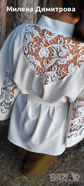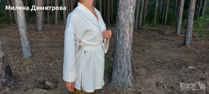 1. Ленено кимоно Ivory Dahlia - това кимоно е специално и единствено по рода си. Ръчно изработено е с грижа от 100% лен, памучна дантела и декоративни ширити в етно стил.