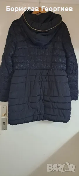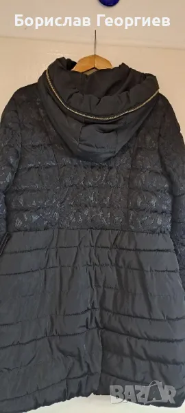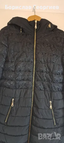 Черно зимно яке тип шуба с декорация от дантела. Размер L. Дължина 86 см, дължина на ръкав 68 см, гръдна обиколка 49 см едностранно. На етикета пише XXL, но не си отговаря.