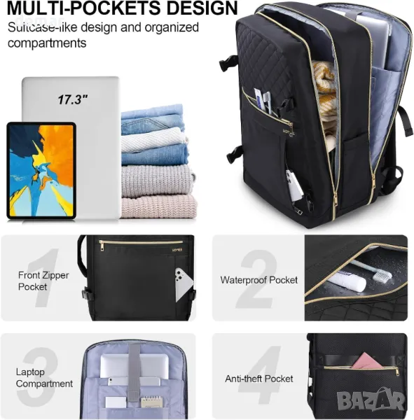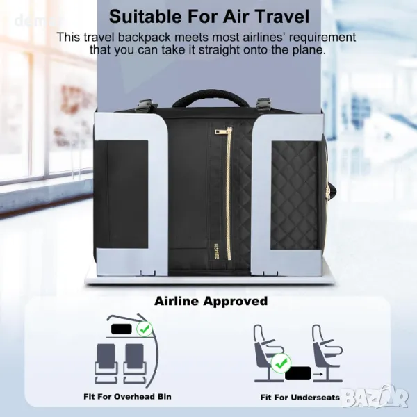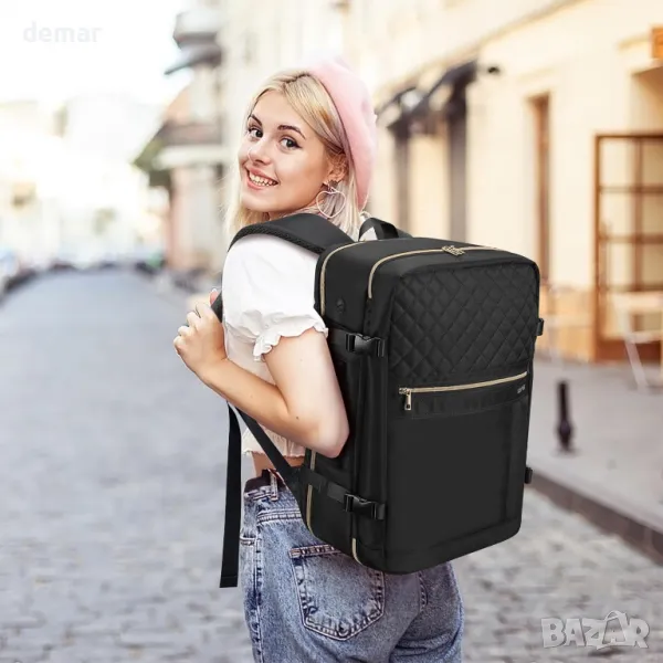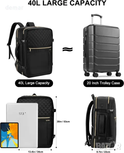 Тази универсална дамска раница за пътуване от 40 литра, с размери 53x34x22 см, е удобна за авиолинии и идеална за пътуване. Разполага с отваряемо на 180° основно отделение за дрехи и отделение за лаптоп за устройства до 17,3 инча, идеално за проверки на сигурността. Дизайнът с голям капацитет включва множество джобове: голям джоб с цип, мрежести джобове за основни неща, мокра чанта за тоалетни принадлежности и джоб за бърз достъп за тъкани. Уникални детайли като прибиращи се странични джобове за бутилки или чадъри, скрит заден джоб за ценности и отделни чанти за обувки и бельо повишават удобството. С дишащи презрамки, колан за багаж за удобство на летището и страничен порт за зареждане, тази многофункционална раница има и подплатена странична дръжка за гъвкаво използване като куфар или раница. Той е подходящ както за пътуващи, пътешественици, така и за ентусиасти на открито.