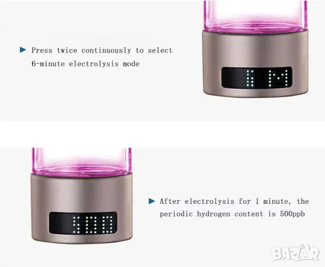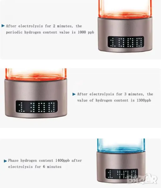 Да не се надвишава 3 пъти 6 минутният режим за 1 бутилка вода! Поради високата концентрация на водород, може да започне да изтича вода!