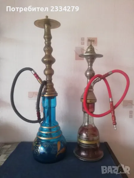 N:1 Голямо старо Египетско наргиле, масивно изработено от синьо стъкло ръчно рисувано, бронзови орнаментирани с египетски тръби с надпис ,,KHAN ELKHALILI, made in EGYPT, с размери 70х17см. , цялото орнаментирано, цена 25€.; N:2 средно наргиле, изработено от цветно червено стъкло ръчно орнаментирано, има масивно бронзово тяло и тръби изцяло с ориенталски орнаменти месингови , тежи 1кг.450гр. размери:60х15см., цена 30€. Ползване и красива оригинална декорация на битова-чорбаджийска къща, кафене-чайна, използване и други идеи. N:3 два броя лули едната има надпис ,,ROYELE GARANTIE", цена 5€. за брой; N:4 стари 100% автентични османски лули за пушене на тютюн хашиш, перфектно за пазени с надпис ,,вишка N:2, ПЛЕВЕНЪ, Хр.Бешовъ, това е стара възрожденска работилница за глинени изделия, цена 7€. за брой (два различни вида).; N:5 стари бензинови запалки, едната е американска ,,Zippo" цена 7€., другата австрийска ,,IMCO" , цена 7€.