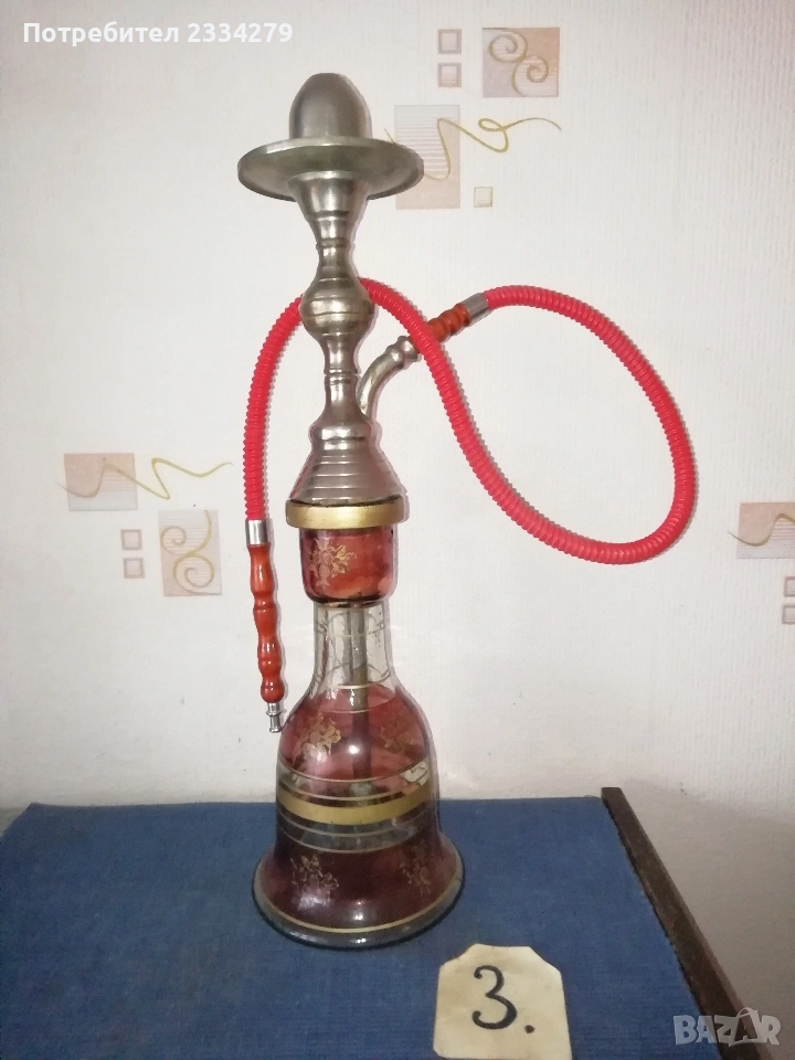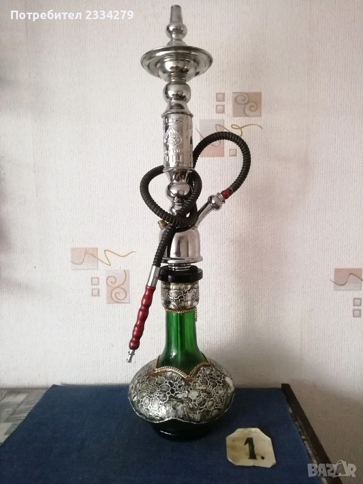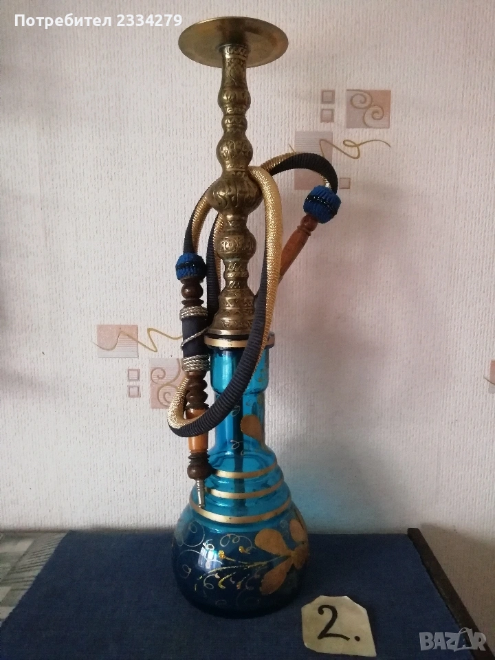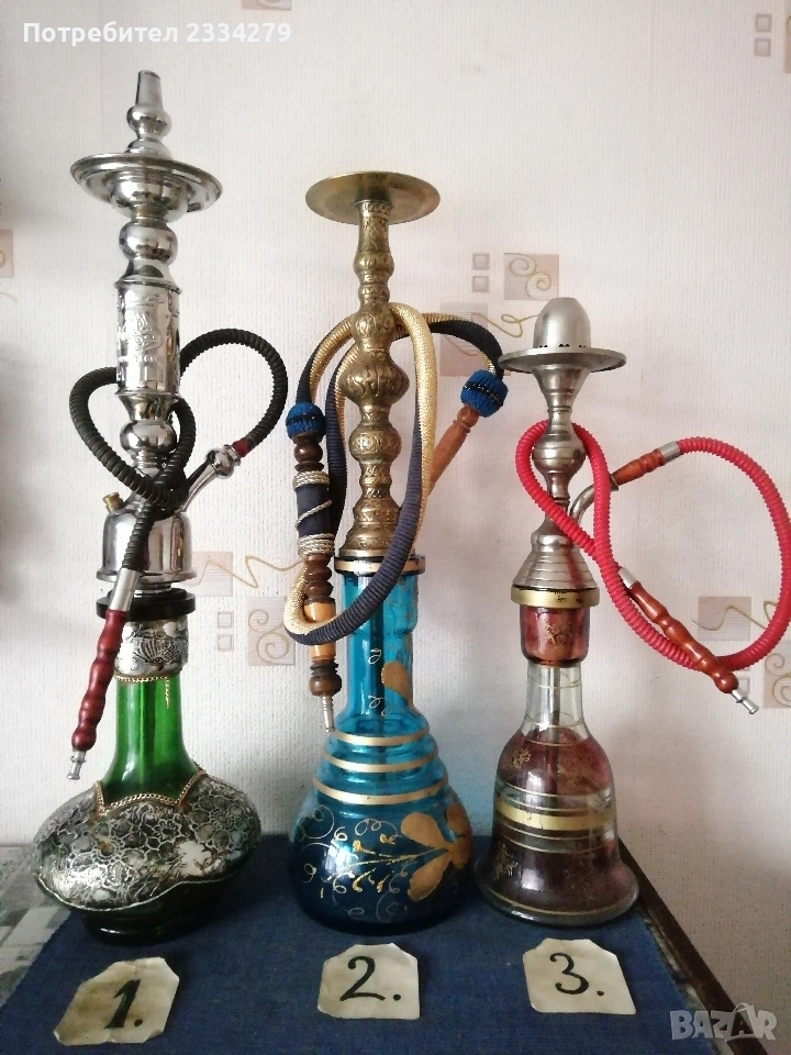 N:1 Голямо старо Египетско наргиле, масивно изработено от зелено орнаментирано стъкло, бронзови орнаментирани с египетски тръби с надпис ,,KHAN ELKHALILI, made in EGYPT, с размери 75х20см., цялото орнаментирано, цена 25€.; N:2 средно наргиле, изработено от цветно синьо стъкло ръчно орнаментирано рисувано, има масивно бронзово тяло и тръби изцяло с ориенталски орнаменти месингови , тежи 1кг.450гр. размери: 63х17см., цена 30€.; N3 ориенталски нергиле с рисувани орнаменти, размер 50х15см.Ползване и красива оригинална декорация на битова-чорбаджийска къща, кафене-чайна, използване и други идеи. N:4 два броя лули едната има надпис ,,ROYELE GARANTIE", цена 5€. за брой; N:5 стари 100% автентични османски лули за пушене на тютюн хашиш, перфектно за пазени с надпис ,,вишка N:2, ПЛЕВЕНЪ, Хр.Бешовъ, това е стара възрожденска работилница за глинени изделия, цена 5€. за брой (два различни вида).; N:5 стари бензинови запалки, едната е американска ,,Zippo" цена 7€., другата австрийска ,,IMCO" , цена 6€.