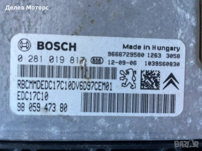 EDC17C10 0281019817 9805947380 ECU компютър от Пежо Партнер 1.6 HDI, 90 кс., 5 скорости, двигател 9HF, 2013г., евро 5Б Peugeot Partner 1.6 HDi, 90 ph., 5 sp., engine 9HF, 2013, euro 5B в автоморга Delev Motors, между с. Каменар и с.Куманово гр. Варна. ВСИЧКИ ЦЕНИ СА С ВКЛЮЧЕНО ДДС. ВСИЧКИ ЧАСТИ СА С 14 ДНИ ПРАВО НА ВРЪЩАНЕ. Изпращане на части чрез наложен платеж с ЕКОНТ с 30% отстъпка от куриерските услуги за цялата страна, получаване на следващият ден. Доставката е за сметка на КУПУВАЧА. Изкупуване на западни и японски автомобили, джипове и бусове след 2015 г. за части. Издаване на удостоверение за бракуване пред КАТ. РАБОТНО ВРЕМЕ ОТ ПОНЕДЕЛНИК ДО ПЕТЪК от 9.00 ч. до 18.00 ч., СЪБОТА ОТ 9.00 ч. ДО 14.00 ч., ПОЧИВЕН ДЕН НЕДЕЛЯ. За контакти: 0897852371