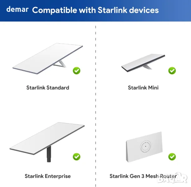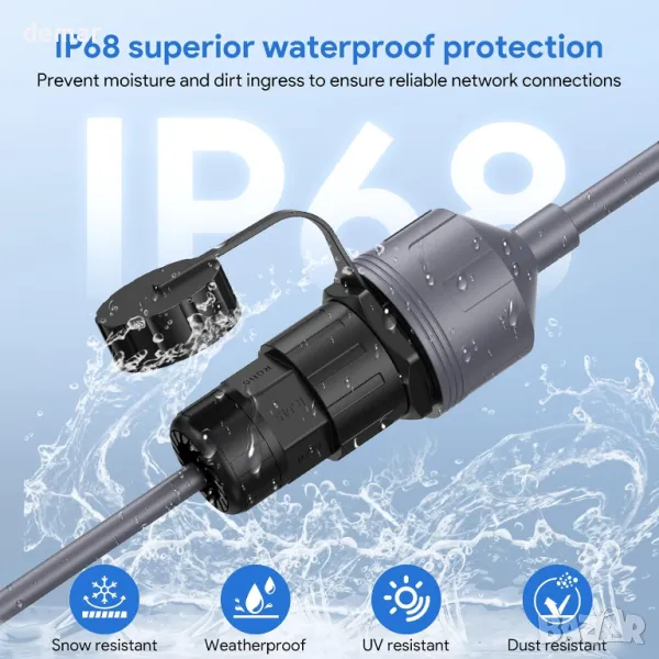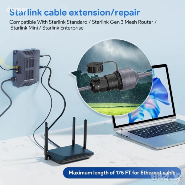MINI Ethernet адаптерът Starlink разполага с издръжливи, патентовани RJ45 конектори от тип запояване за надеждна производителност при всякакви метеорологични условия, намалявайки контактното съпротивление с 50% за оптимална употреба със системата Starlink Gen 3 (REV4). Позволява лесно разширяване и ремонт на мрежи с кабели с всякаква дължина (препоръчва се под 50 метра, за да се сведе до минимум загубата на сигнал) и предлага стабилна водоустойчива защита с рейтинг IP67 срещу фактори на околната среда. Изработен от чиста мед 24AWG и изцяло метално екраниране, той осигурява високоскоростно предаване на данни до 1200Mbps с минимални смущения за надеждна свързаност.