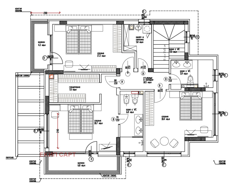 Вътрешно стълбище води до втория етаж, който включва три големи спални /17,3 кв.м., 18,7 кв.м. и 18,4 кв.м./, две от които с излаз на балкон /съответно 4,3 кв.м. и 6,8 кв.м./, дрешник /7 кв.м./, коридор и две бани с тоалетни /6,8 кв.м. и 5,9 кв.м./.