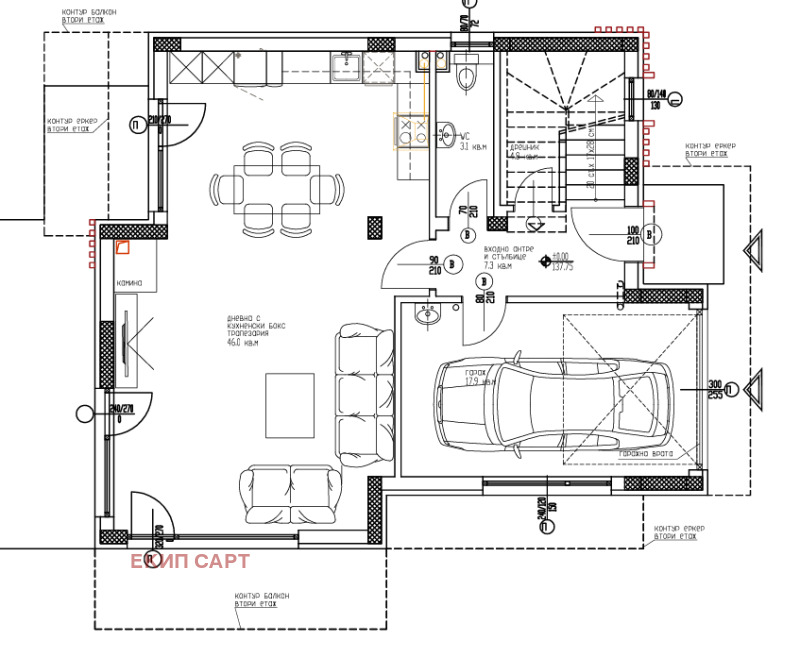 Първият етаж със застроена площ 95,4 кв.м. се състои от входно антре, просторна дневна с кухненски бокс /46 кв.м./, килер /5 кв.м./, тоалетна /3,3 кв.м./ и гараж.