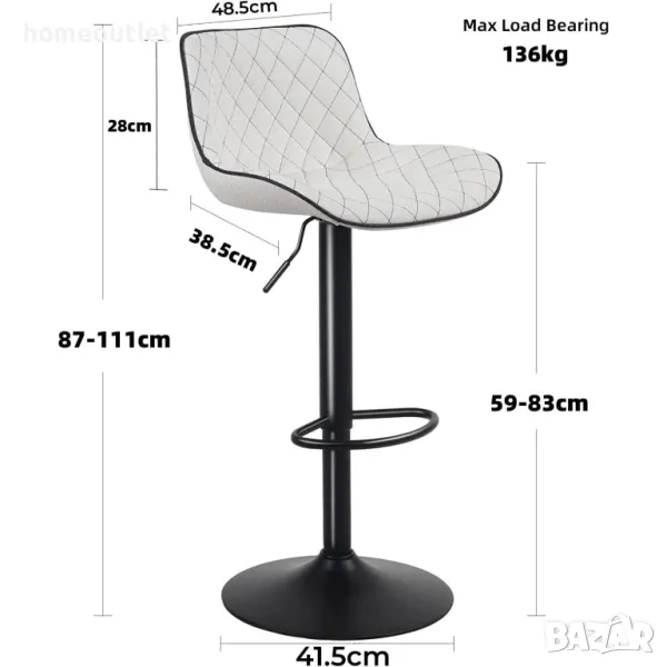 Бар столът може да се регулира плавно на височина от 59 см. до 83 см. чрез повдигане на лоста под седалката с лекота. Въртящата се на 360 градуса седалка ви позволява да разговаряте с приятелите си по-свободно.