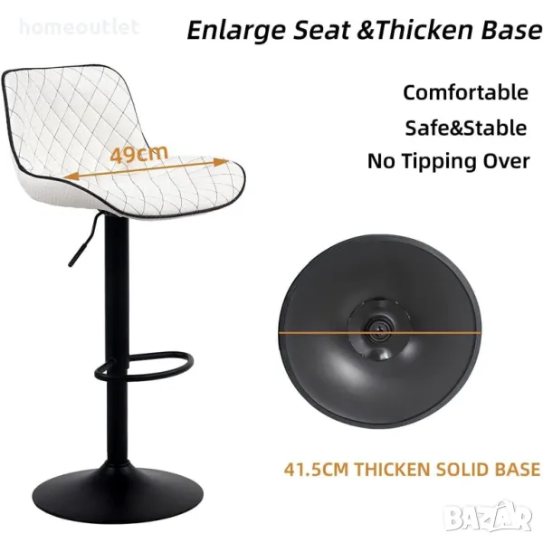 Тези бар столове предлагат страхотна стабилност с широка основа (диаметър на основата 42 см.), която е прикрепена с гумен пръстен, за да предпази пода от надраскване. Газовият повдигащ механизъм е сертифициран от SGS. Може да поддържа до 130 кг. в статично състояние.