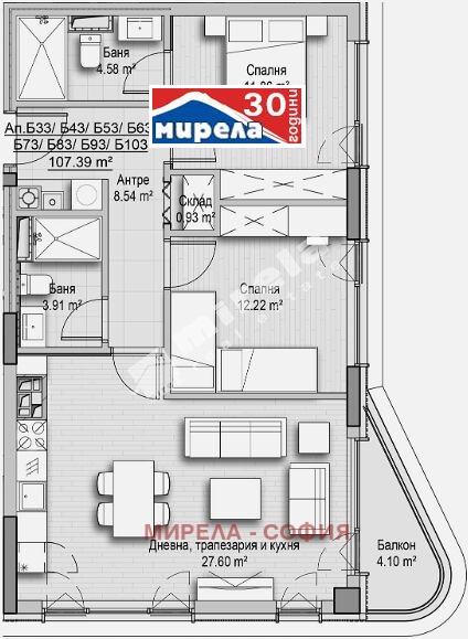 Апартамент Б43, който представям тук, е със следното разпределение: антре, дневна с кухненски бокс и трапезария, две спални, две бани с тоалетна и балкон. Изложението е благоприятно - югоизточно и се намира на 4-ти от 18 етажа.