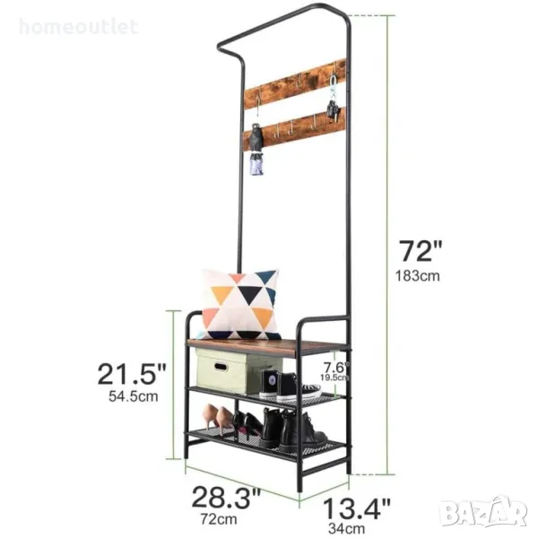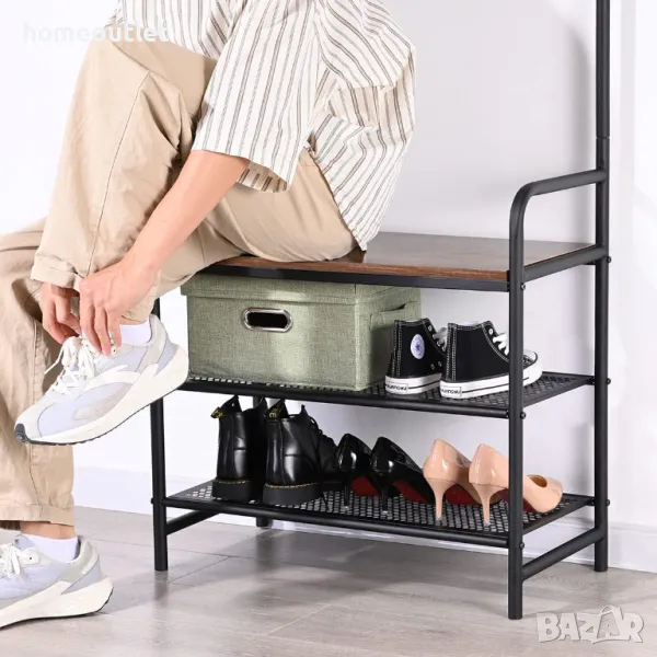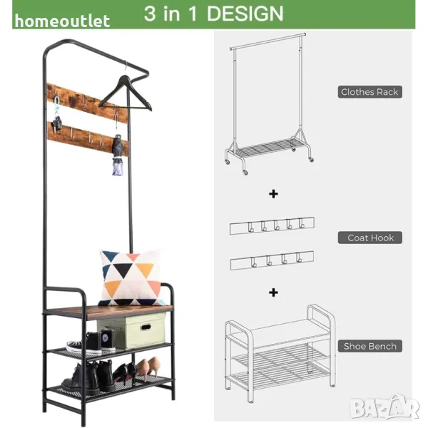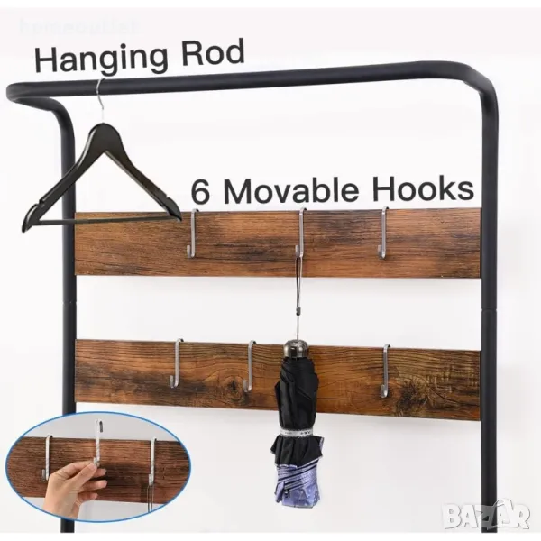 Тази стойка за дрехи е оборудвана с прът, 6 кукички за окачване, 2 рафта за обувки и пейка, които могат да отговорят на всичките ви нужди за съхранение на дрехи, аксесоари, дребни предмети и обувки едновременно, като допълнително оптимизират вашето място за съхранение.