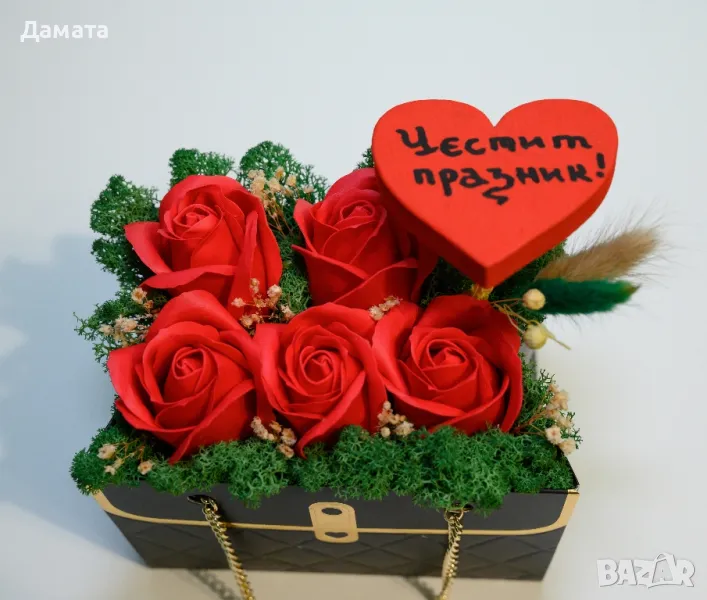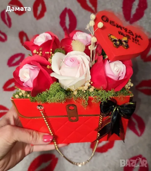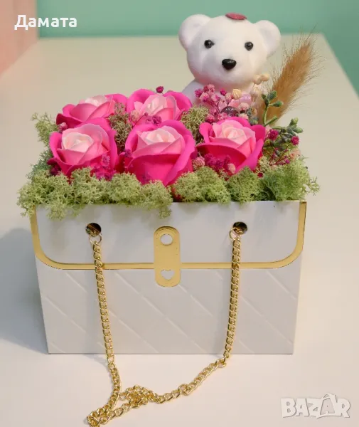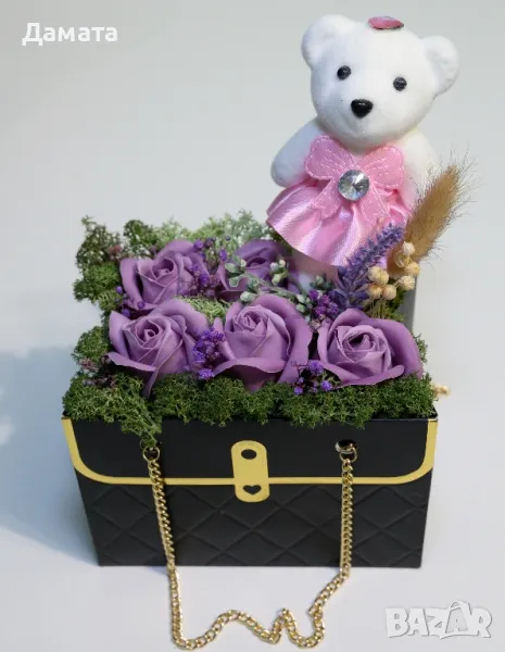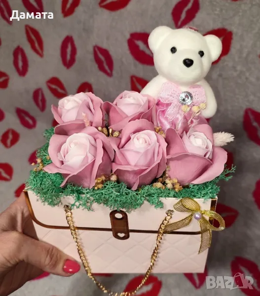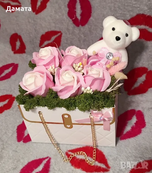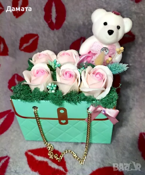Чантички с рози от пластичен сапун , скандинавски мъх , мече и други сухи цветя .Може да се добави табелка / тагче за всеки повод - "Честит празник! ", "Честит рожден ден !" , Честит 8 - ми март !" , "Честит юбилей! " и т.н.Размер на чантичката ( без декорацията) - 16 / 11 см .