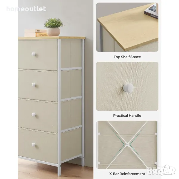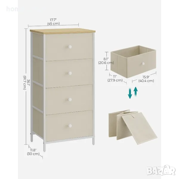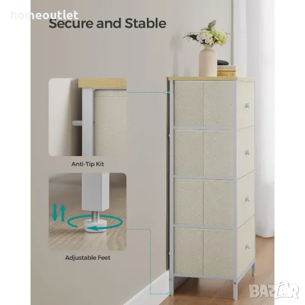 Спестяващ място вертикален шкаф за съхранение с 4 платнени чекмеджета, зашеметяващ външен вид, който ще стилизира всяко жизнено пространство, лек дизайн за лесно преместване, 4 регулируеми крачета, лесно сглобяване и възможност за поддръжка на подреден дом.