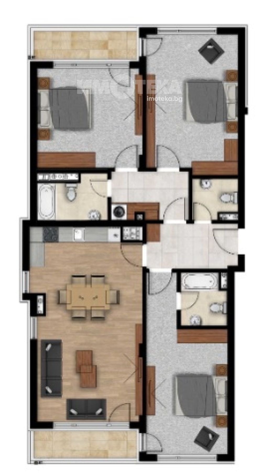 Многостаен апартамент състоящ се от дневна с кухненски бокс, три спални, три бани и две тераси. Гараж включен в цената.
