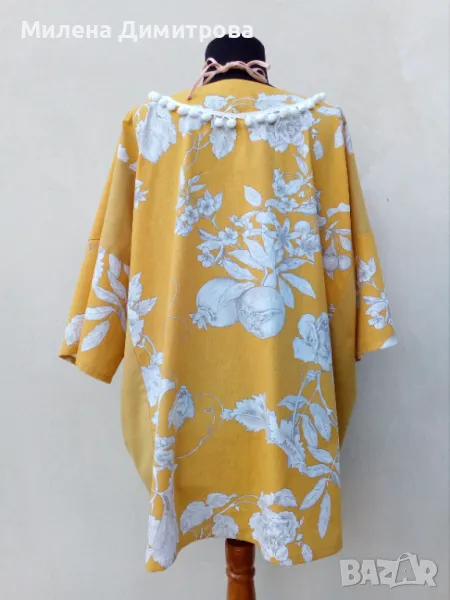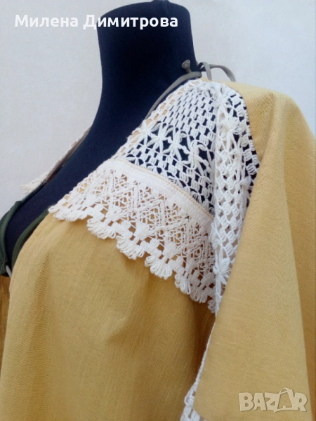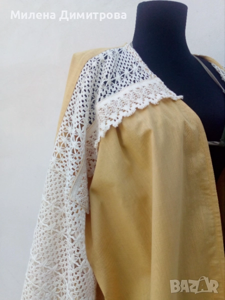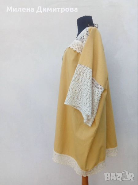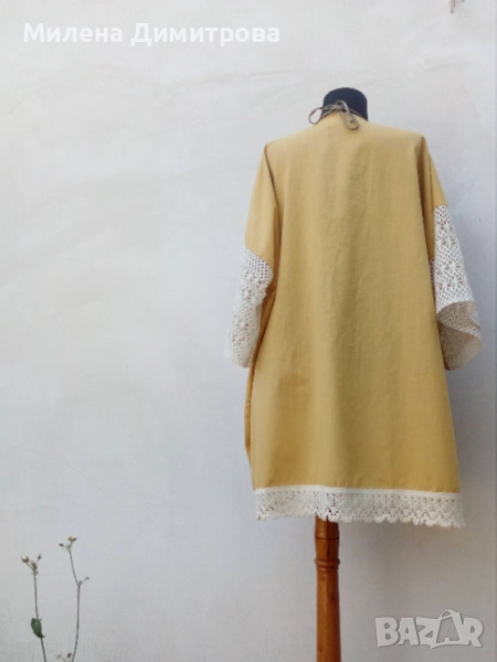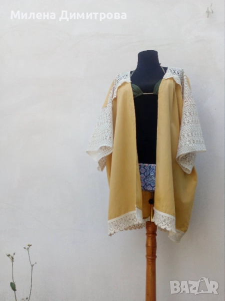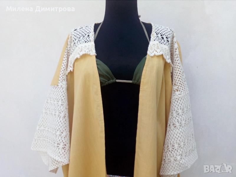 3. Ръчно изработено кимоно от 100% памук в цвят охра и светло бежова памучна дантела. Свободна, оувърсайз кройка, подходящо за дами с размер от S до L.
