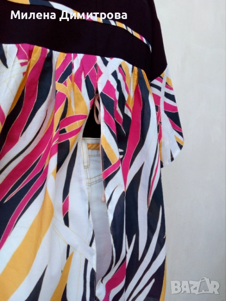 2. Ръчно изработено кимоно от фин памук в бял-цикламен абстрактен принт и черен декоративен помпон, с дълбок отвор на гърба.