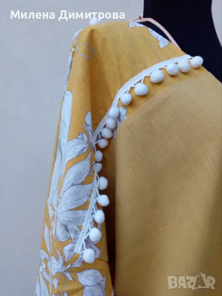1. Дамско кимоно ръчна изработка в красива охра на бели цветя и бели помпони.
