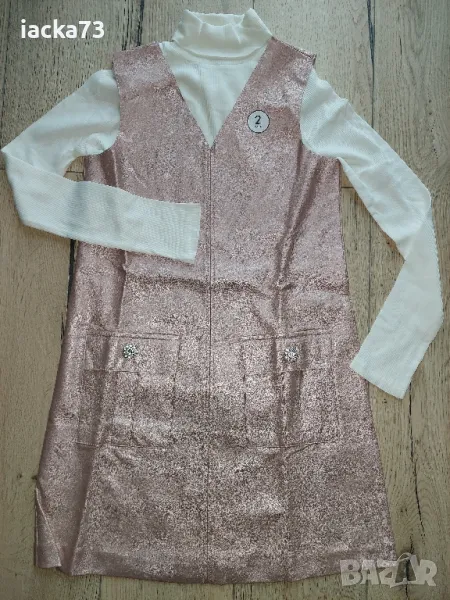 Нов комплект сукман в розово от мека имитация на кожа с два джоба декорирани с красиви лъскави копчета,модела е трапец и бяла блузка рипс с поло яка. Нов с етикет. Размер 12г