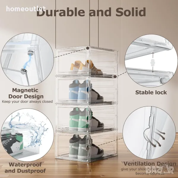 Нашите кутии за обувки са изработени от твърда пластмаса, което прави цялата конструкция по-здрава и стабилна, а повърхността е устойчива на износване и издръжлива.