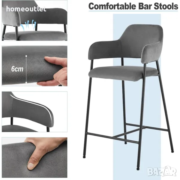 Този висок бар стол е изработен с дамаска от висококачествено кадифе, меко и удобно, а подплатената седалка е изпълнена с плътна пяна, осигуряваща отличен комфорт и меко усещане при седене.