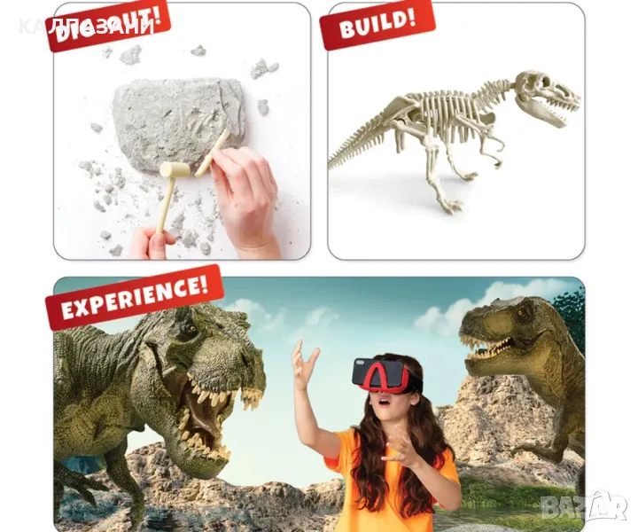Използвайте включените длето и инструменти за разкопки, за да изкопаете свой собствен фосил на T-Рекс, след което сложите включените VR очила, докато разглеждаме по-отблизо тези завладяващи същества във виртуална реалност! Върнете се назад във времето, за да изживеете света на динозаврите както никога досега! Изследвайте науката зад това как най-големите същества, живели някога, с поглед отвътре как са управлявали света! Този комплект дейности включва книга от 40 страници на български език, която се гмурка във величествения свят на динозаврите, VR очила, комплект за разкопаване на вкаменелости на динозаври и всички инструменти и материали, от които се нуждаете, за да насърчите ученето чрез игра! От преследване с джип на T-Рекс и разходка с влакче в увеселителен парк, до обиколки на музеи и места за разкопки на вкаменелости, изследвайте света на динозаврите в зашеметяваща виртуална реалност! Този завладяващ комплект дейности включва колекционерски плакат и всички материали, от които се нуждаете, за да изкопаете своя собствен вкаменелост, включително VR очила за изследване на динозаври във виртуална реалност!
