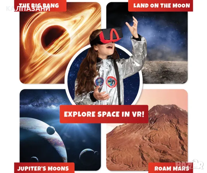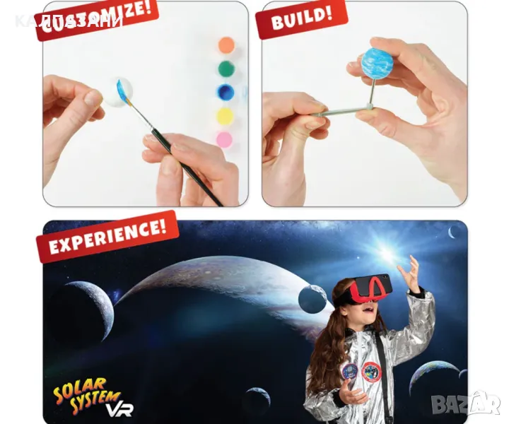 Ученето за планетите в нашата Слънчева система никога не е било толкова забавно! Представете си, че летите през космоса, докато откривате черни дупки, ракети, сателити и дори Международната космическа станция във виртуална реалност! Включва книга от 40 страници и очила за виртуална реалност, заедно с дейност за изграждане и персонализиране. Подгответе се да разгледате слънчевата система както никога досега с този интерактивен комплект за космоса и науката, предназначен да възпроизведе силата на слънцето, за да демонстрира връзката между нашите планети! Рейте се из нашата слънчева система във виртуална реалност, докато се докосвате до ракети, роувъри, черни дупки и други в този интерактивен комплект дейности! Този интерактивен комплект за дейности включва пълен набор от бои, заедно с четка за изграждане и персонализиране на вашия собствен функционален планетариум на слънчевата система, докато учите за нашите планети и връзката им със слънцето! След това сложете включените VR очила, за да се телепортирате през галактиката във виртуална реалност. Брошура от 40 страници на български език включва всичко, което трябва да знаете за нашата слънчева система и много повече!