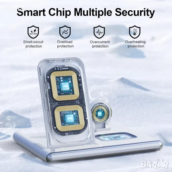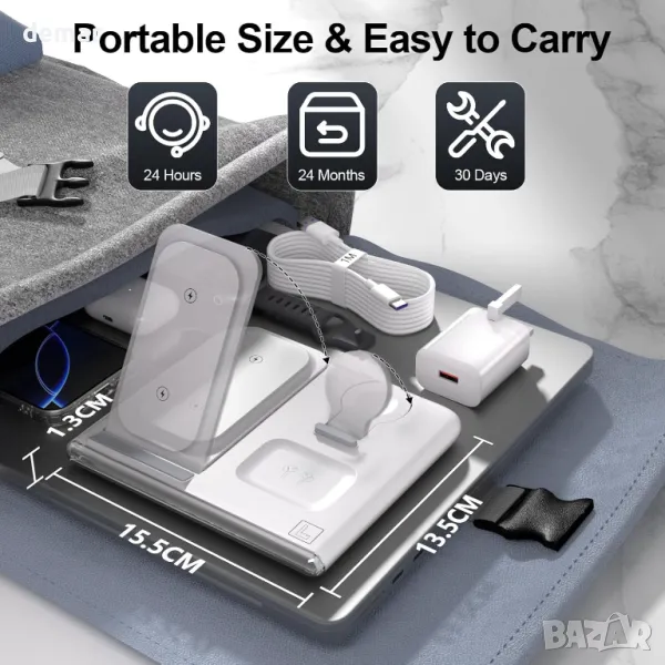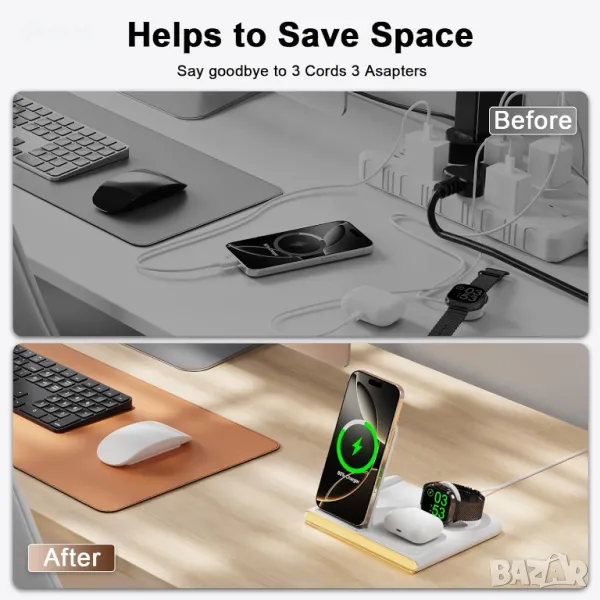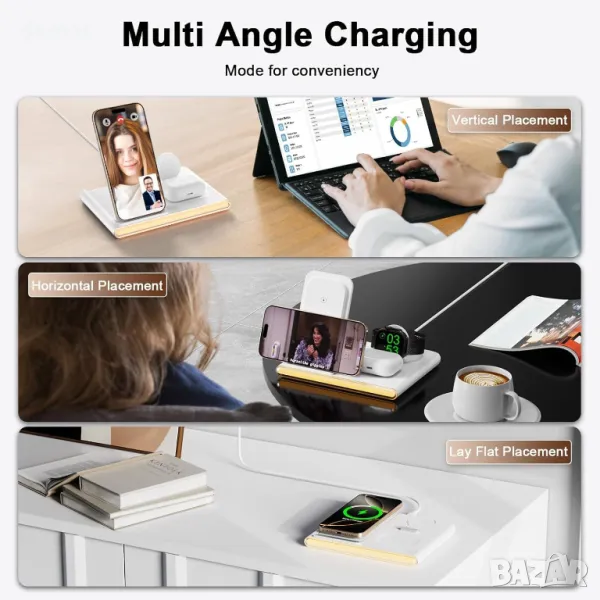 Тази 3-в-1 безжична станция за зареждане поддържа широка гама от устройства, включително модели iPhone, Apple Watches, AirPods и Samsung Galaxy, позволявайки едновременно зареждане на телефони, часовници и слушалки, за да се намали бъркотията и да се опрости зареждането. Неговата ефективна технология за бързо зареждане осигурява до 15 W за телефони, 5 W за AirPods и 3 W за часовници, с отвори за разсейване на топлината за безопасно и ефективно зареждане. Двойните бобини за зареждане осигуряват хоризонтално или вертикално зареждане на телефона, докато регулируемите ъгли (0°-70°) го правят универсален за видео разговори, текстови съобщения или гледане на видеоклипове. Компактен и удобен за пътуване, той включва мека, топла нощна светлина за нежно нощно сияние и тиха работа, която няма да наруши съня. Съвместим с калъфи за телефони с дебелина до 3 mm, идва с 18 W QC 3.0 зарядно устройство, USB-C кабел и ръководство за потребителя за цялостно решение за зареждане.