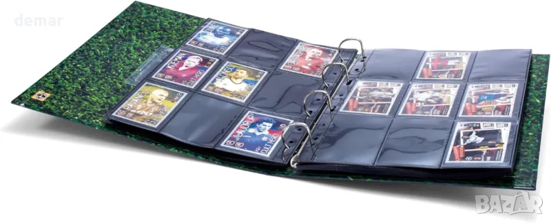 Албум с карти за обмен, предназначен да побере до 315 карти или 35 листа с формат A4, включващ прозорец за преглед за персонализиран дизайн на корицата с карта за обмен. Включва пет черни листа Grande Pro, комплект стикери със знамена на държави и години за персонализирано етикетиране и пръстеновиден механизъм, съвместим с 3x3 ръкави за търговски карти. Издръжливата подвързия с твърди корици осигурява дълготрайна защита, а албумът е с размери 300x325x58 мм. За оптимална употреба се препоръчват съвместими пластмасови листове Grande Pro (арт. № 371773).