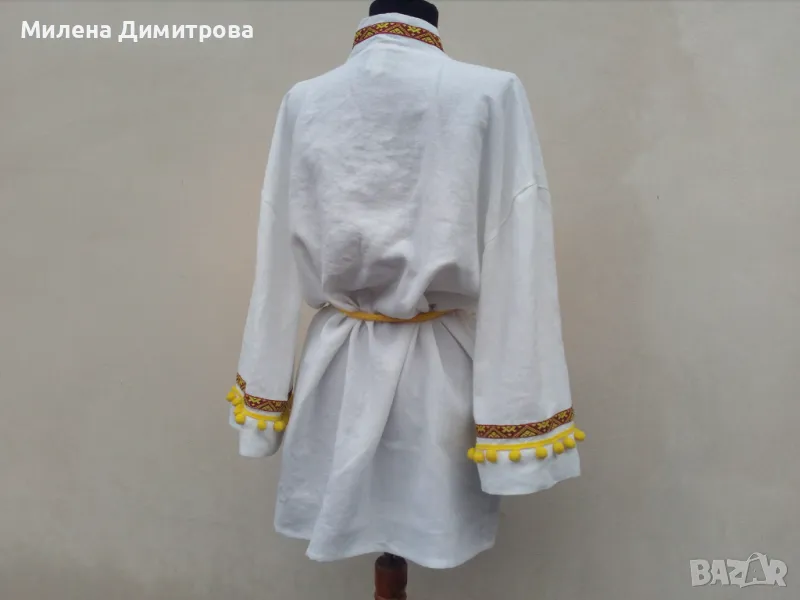 Прекрасно ръчно изработено кимоно Halkidiki - изработено от ленено-памучна материя, жълт помпон и червено жълти декоративни ивици.