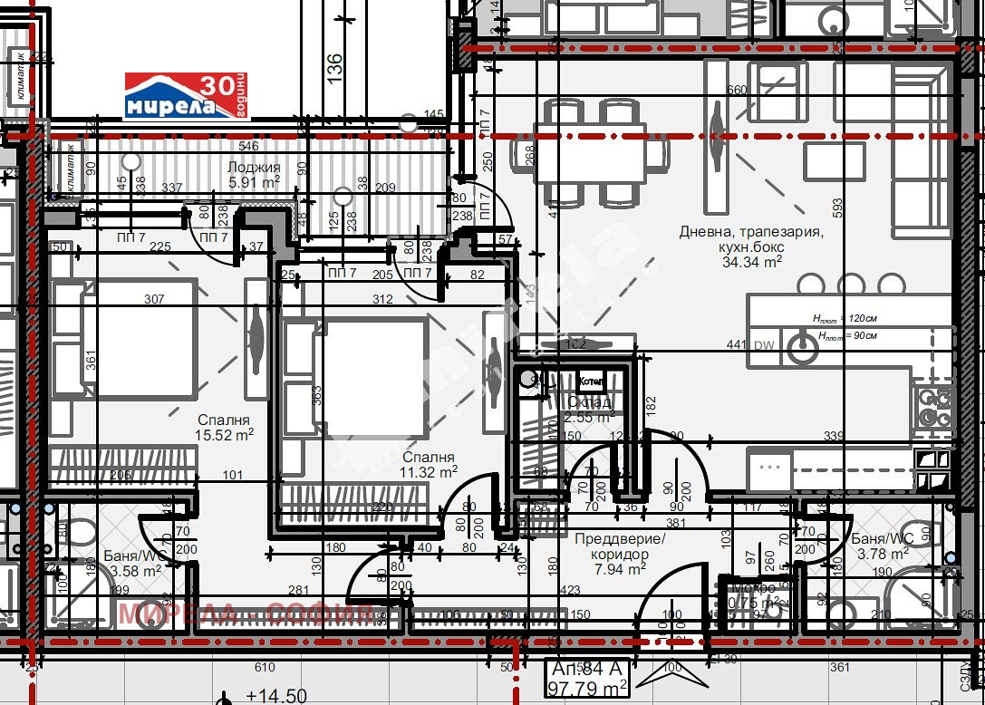 ЕТАП НА СТРОИТЕЛСТВО: завършен груб строеж (Акт 14); Има 1 балкон/тераса; Непреходен; ВИД СТРОИТЕЛСТВО: тухла; ЗАСТРОЕНА ПЛОЩ 97.79 кв.м; ПУСКОВ СРОК: 06.2027; ИЗЛОЖЕНИЕ: север; СПАЛНИ: 2; БАНИ: 2; ДОГРАМА: PVC