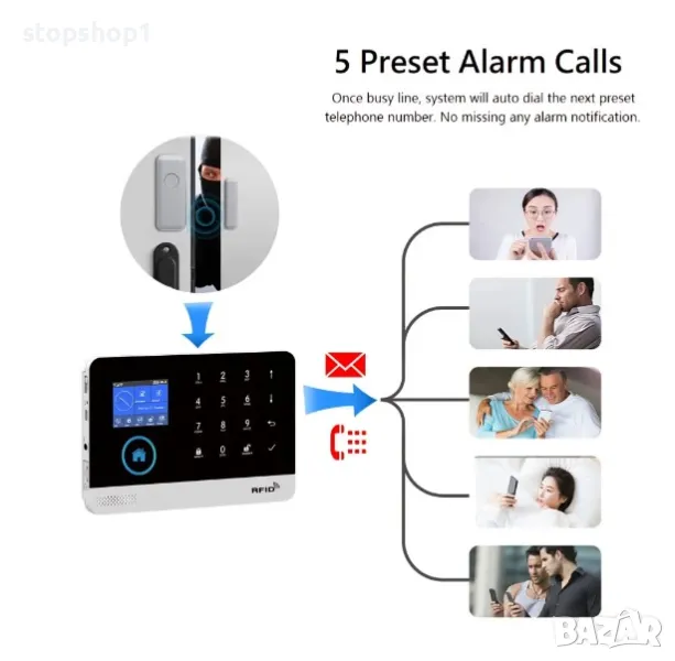 Изход за аларма: Аларма за сирена, App Push, sms, телефонно обаждане