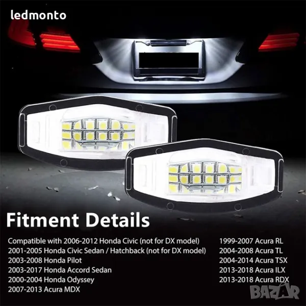 Тази страница предлага двойка високо мощни 18-SMD-1210 LED лампи за задни номера за следните модели на Honda/Acura: