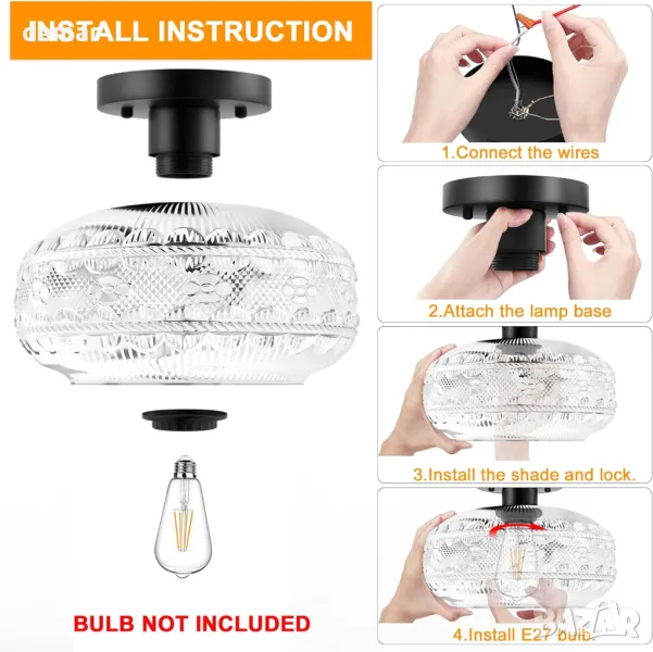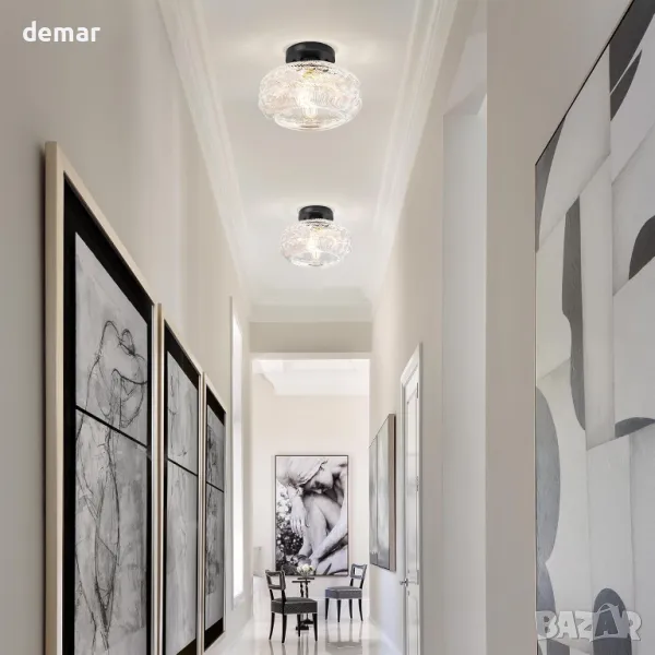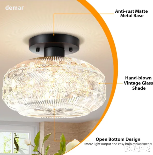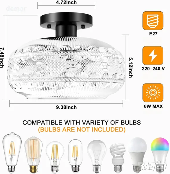 Тази елегантна полуравна таванна лампа съчетава винтидж чар с модерен стил, включваща ръчно издухан стъклен абажур с флорални гравюри и издръжлива метална основа, което я прави едновременно функционална светлина и декоративна част. Поддържа основни крушки E27 (не са включени, максимум 6 W) и е съвместим с различни типове крушки за персонализирана атмосфера. С размери 23,9 cm x 23,9 cm x 19 cm, той включва всички аксесоари за монтаж за лесна инсталация, като се препоръчва професионална инсталация. Идеален за коридори, спални, кухни и много други, той добавя вечен щрих към всяко пространство.