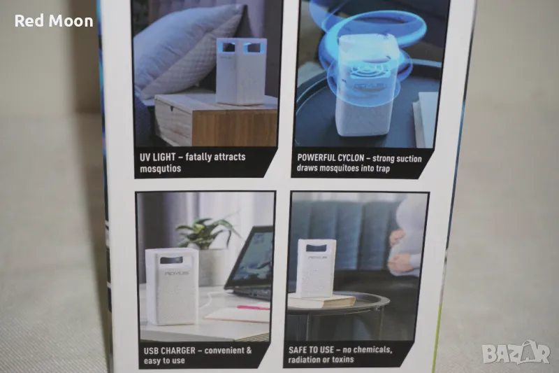 светлина, с дължина на вълната 395 - 405 nm, която примамва комарите към уреда и далеч от хората. След като се приближат, мощният вътрешен вентилатор създава циклон, който ги засмуква преди да успеят да ухапят някого или да започнат да се размножават, като по този начин предпазва теб и семейството, без употребата на вредни емисии.