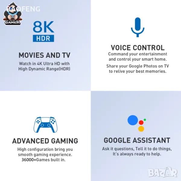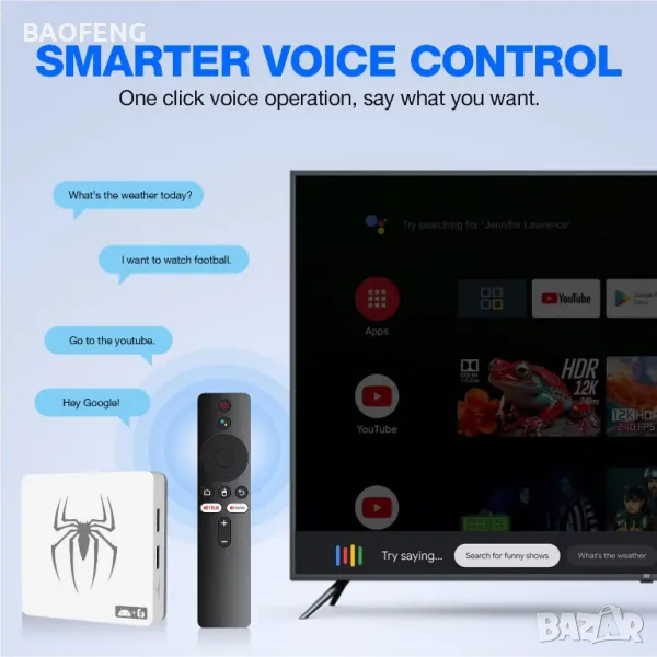 - Лесна настройка и контрол: С Bluetooth Voice Remote можете да навигирате, търсите и контролирате съдържанието си без усилие само с гласа си.