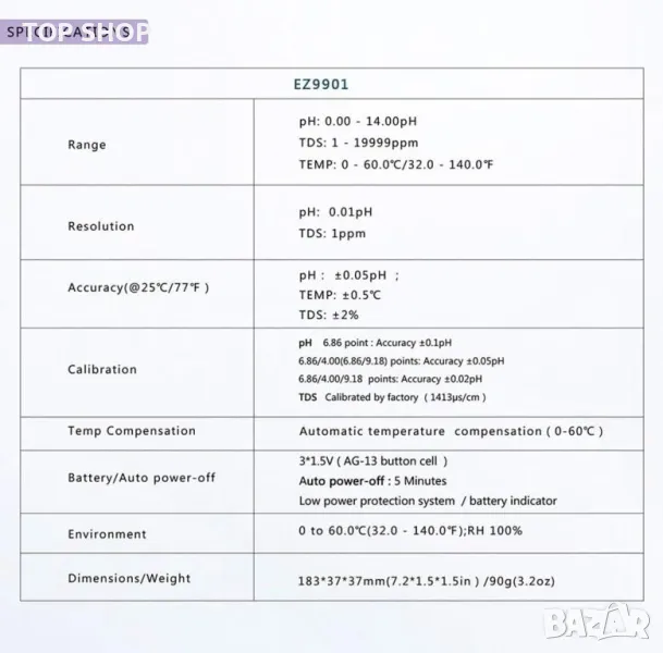 Ръчен цифров измервателен уред EZ9901 3 в 1 TDS/PH/TEMP Тестер за вода Писалка за басейн Лаборатория, снимка 1 - Басейни и аксесоари - 48853501 Ръчен цифров измервателен уред EZ9901 3 в 1 TDS/PH/TEMP Тестер за вода Писалка за басейн Лаборатория, снимка 2 - Басейни и аксесоари - 48853501 Ръчен цифров измервателен уред EZ9901 3 в 1 TDS/PH/TEMP Тестер за вода Писалка за басейн Лаборатория, снимка 3 - Басейни и аксесоари - 48853501 Ръчен цифров измервателен уред EZ9901 3 в 1 TDS/PH/TEMP Тестер за вода Писалка за басейн Лаборатория, снимка 4 - Басейни и аксесоари - 48853501 Ръчен цифров измервателен уред EZ9901 3 в 1 TDS/PH/TEMP Тестер за вода Писалка за басейн Лаборатория, снимка 5 - Басейни и аксесоари - 48853501 Ръчен цифров измервателен уред EZ9901 3 в 1 TDS/PH/TEMP Тестер за вода Писалка за басейн Лаборатория, снимка 6 - Басейни и аксесоари - 48853501 Ръчен цифров измервателен уред EZ9901 3 в 1 TDS/PH/TEMP Тестер за вода Писалка за басейн Лаборатория, снимка 7 - Басейни и аксесоари - 48853501 Ръчен цифров измервателен уред EZ9901 3 в 1 TDS/PH/TEMP Тестер за вода Писалка за басейн Лаборатория, снимка 8 - Басейни и аксесоари - 48853501 1/8