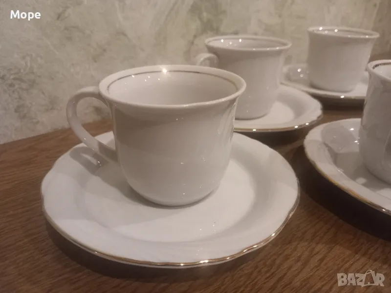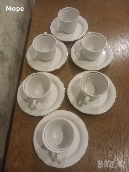 Порцеланови чаши за кафе в комплект с чинийки, височина 5,5 см. и диаметър 6,5 см. с златист кант в отлично състояние без забележки. Изпращам с Еконт и Спиди, за София предпочитам лично предаване.