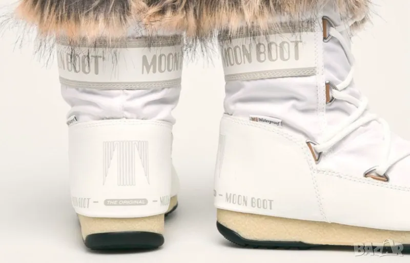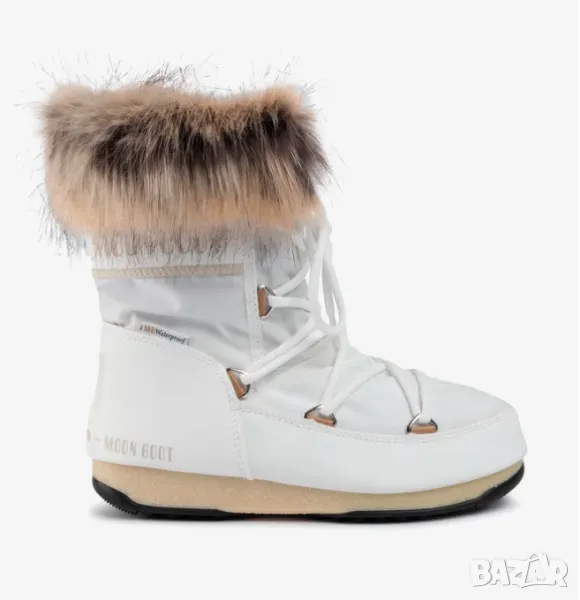 Дамски обувки от Moon Boot.Стилни ботуши за зимата Monaco с косъм и връзки отпред са задължителни обувки през зимния сезон. Подплатен найлонов материал и водоустойчива мембрана гарантират качество и водоустойчивост. Белите ботуши са модерно парче, с което ще блеснете на склона, на разходка в града или сред природата. Подходящи са за ежедневно носене.