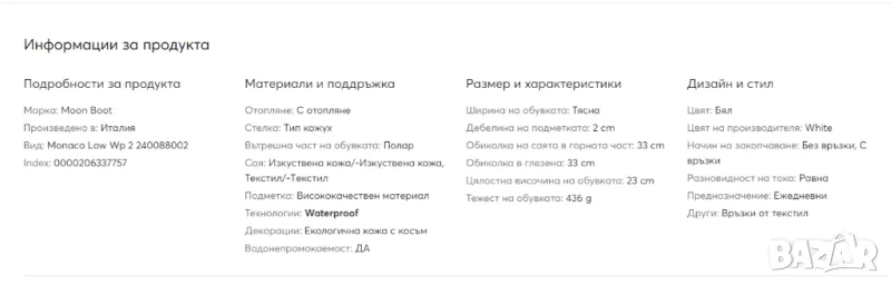 Отличителни, красиви, стилни и модерни - това са основните характеристики на ботушите Moon Boot. Moon Boot създаде колекция от зимни ботуши в оригинална визия. Monaco Low WP 2 са маркови обувки за сняг, които винаги са модерни. Удобни дамски зимни боти, които са водоустойчиви благодарение на Waterproof мембраната. Водоустойчивата подплата и функционалните материали поддържат краката ви топли. Първокласните технически материали и традицията на Moon Boot са гаранция за качество.