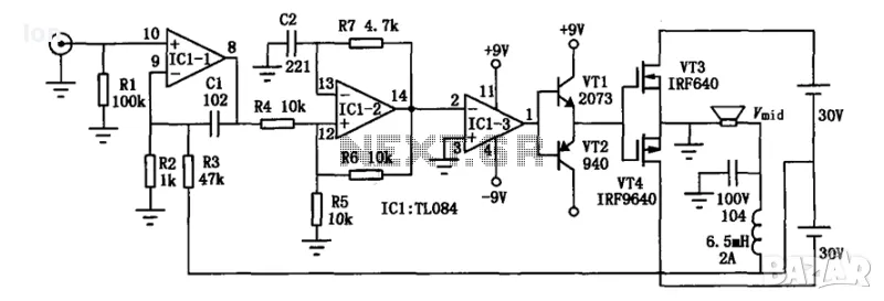На трета снимка има показан цифров (клас D) усилвател с TL084 и MOSFET транзистори на изхода.