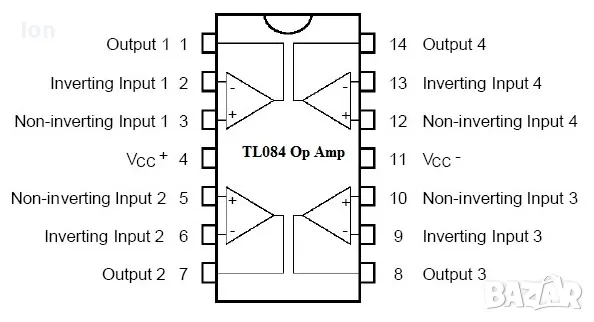 TL084 Четворен операционен усилвател с полеви транзистори на входа, молошумящ