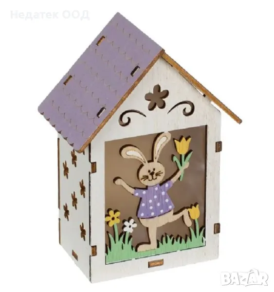 Декоративна дървена къща със зайче и топло вътрешно осветление 1 led. Има бутон ON/OFF и може да се постави на маса. Работи с 2 батерии тип LR44 (не са включени).